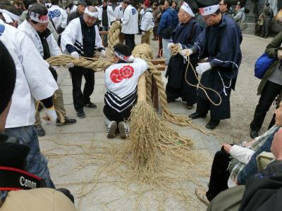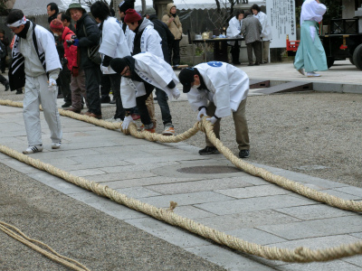 綱引神事は、八頭八尾の「八岐大蛇」形の綱をつくり、境内でその年の恵方に引き合う、というものになっているようです。