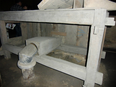 炉とふいごの接合部と、 表の水車小屋から送られてくる空気の接合部