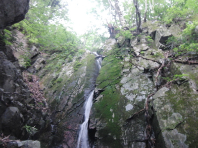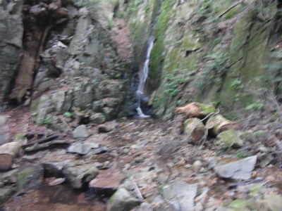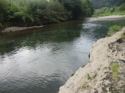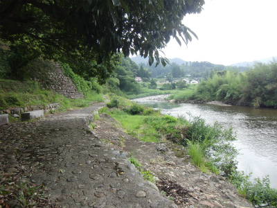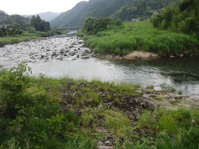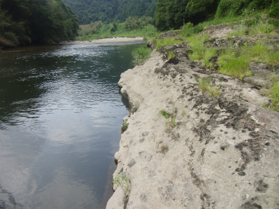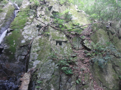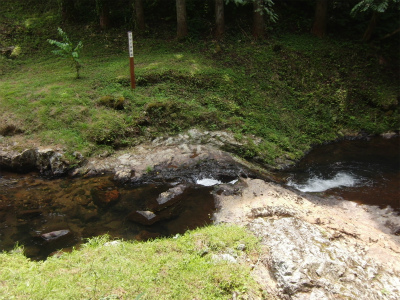 後、写真ではわかりにくいのですが、 岩肌が少し赤くなっています。これはたたらから出る鉄滓(のろ)をはじめとした鉄くずが、 川に流れ錆びて岩肌にこびりつく為赤くなってしまうのだそうです。