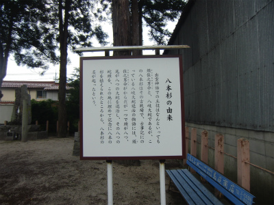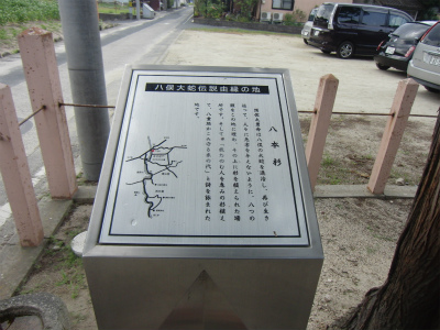 出雲神話での主役はなんといっても須佐之男命と八岐大蛇であるが、この八本杉はその古戦場で、古事記にのっている八岐大蛇退治の物語には、須佐之男命がからだが一つで頭が八つ、尾が八つの大蛇を退治し、その八つの蛇頭を、この地に埋めて記念に八本の杉を植えられたところから、八本杉の名が起こったという。