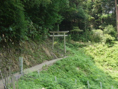 駐車スペースから古びた木の鳥居と、その奥へ続く道が見えます。