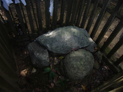 その時の酒壷の一つを祀ったものである。昔土民がこの壷に触れたところ、俄に天はかきくもり山は鳴動して止まず、八本の幣と八品の供物を献じて神に祈ったところようやく鎮まったという。村人たちは人の手に触れることを恐れ多くの石で壷をおおい玉垣で囲み、注連縄をめぐらし昔のままの姿で昔のままの場所に安置することにつとめ現在にいたっているものである。