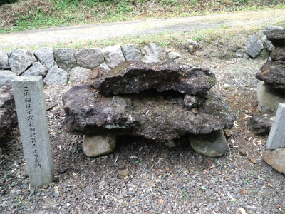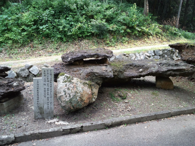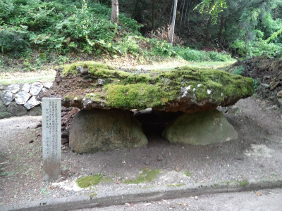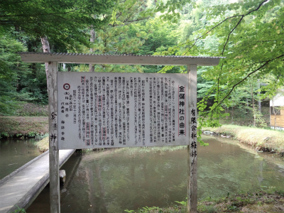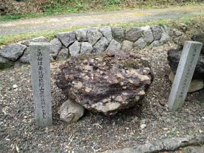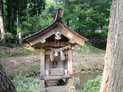 明治の初め、日本一の鉄の守護神の御神徳を称え、大神に相応しい、日本一の石造りの鳥居を建立しようと、この里の岩屋谷の石を切り加工し、土のうを積んで組み立てた由、石柱はこの川を渡すことができず、2つに切って切って渡したと伝えられています。