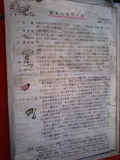 ①大阪市は道路都市計画上、 昔から幾度も伐採を試みられたが、 常に伐採をした者は不慮の事故が生じるので断念されたとの事です。(どうしても大明神のお怒りにふれるのです!)