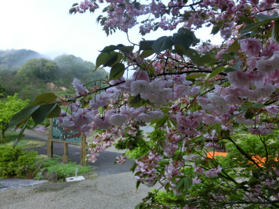 (右) 道中でも見かけましたが、駐車場脇にはまだ花を付けている山桜もありました。