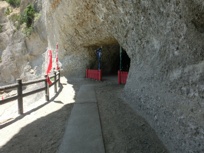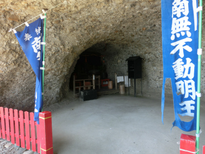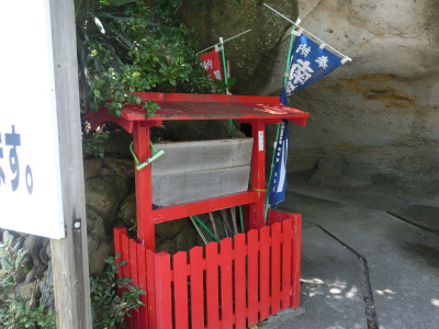 看板の右手、のぼりとの間に洞窟があったのです。そしてその洞窟の奥になにやら祀られている様子。