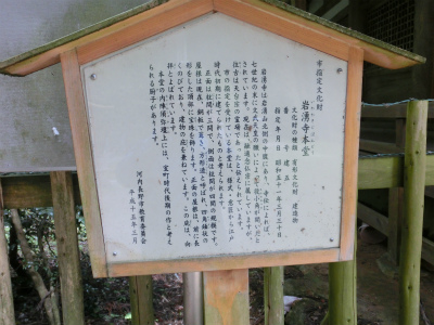 この寺は、岩湧山北側中腹に位置し、文武天皇の勅願寺で役小角の開基であるとされている。 境内には本堂(市指定文化財) 多宝塔(国 重要文化財) 庫裡が配置され、本堂は江戸時代初期のもので本堂内にある厨子は室町時代後期のものと言われている。