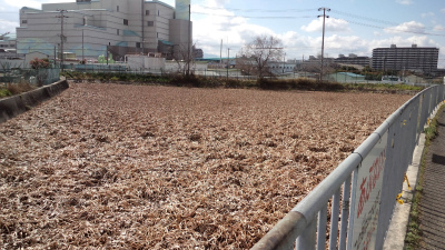 池の水面は、蓮か何かの枯れた葉でほぼくまなく覆われていました。